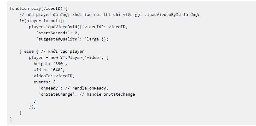 Việc xử lý Play khá đơn giản, đó là bạn chỉ việc dùng đối tượng Player của API đã cung cấp, tham số truyền vào chỉ là videoId mà bạn lấy được ở trên.